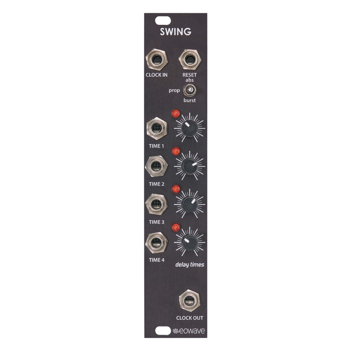eowave Swing (スウィング ) モジュールは、あなたのシーケンス・パターンにリズミカルな動きと「スウィング 」を注入します。これは、 4ステージのクロック・ディレイで、各ステージのディレイタイムを選択し、CVコントロールすることができます。
