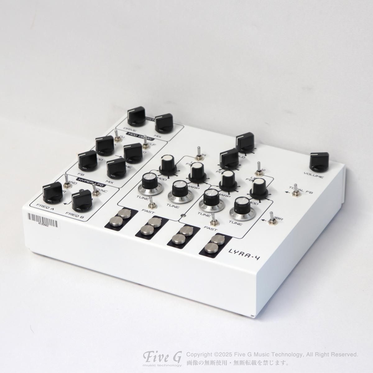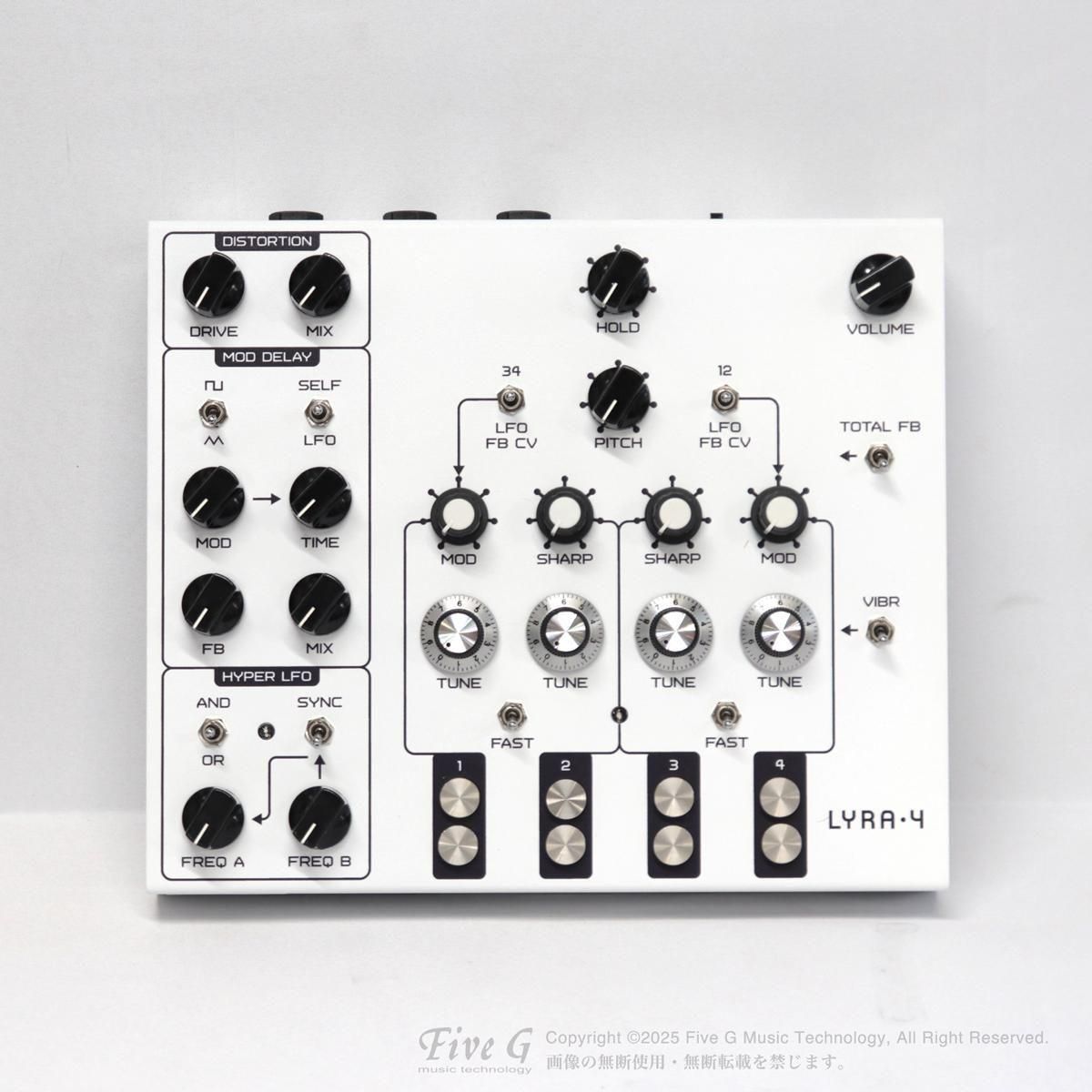 LYRA-4(ライラ・フォー)は、4チャンネルの音源を搭載したオーガニック・ドローン・シンセサイザーです。伝統的なシンセサイザーとは一線を画す特別な設計をしており、そのサウンドは美しいサウンド・スケープから荒々しい怪物の咆哮の様なサウンドまで独特な音世界を展開します。LYRA-4 は各チャンネルに用意された金属製タッチ・センサーに触れる事で演奏し、その触り方や演奏者のコンディションによりサウンドが有機的に変化します。