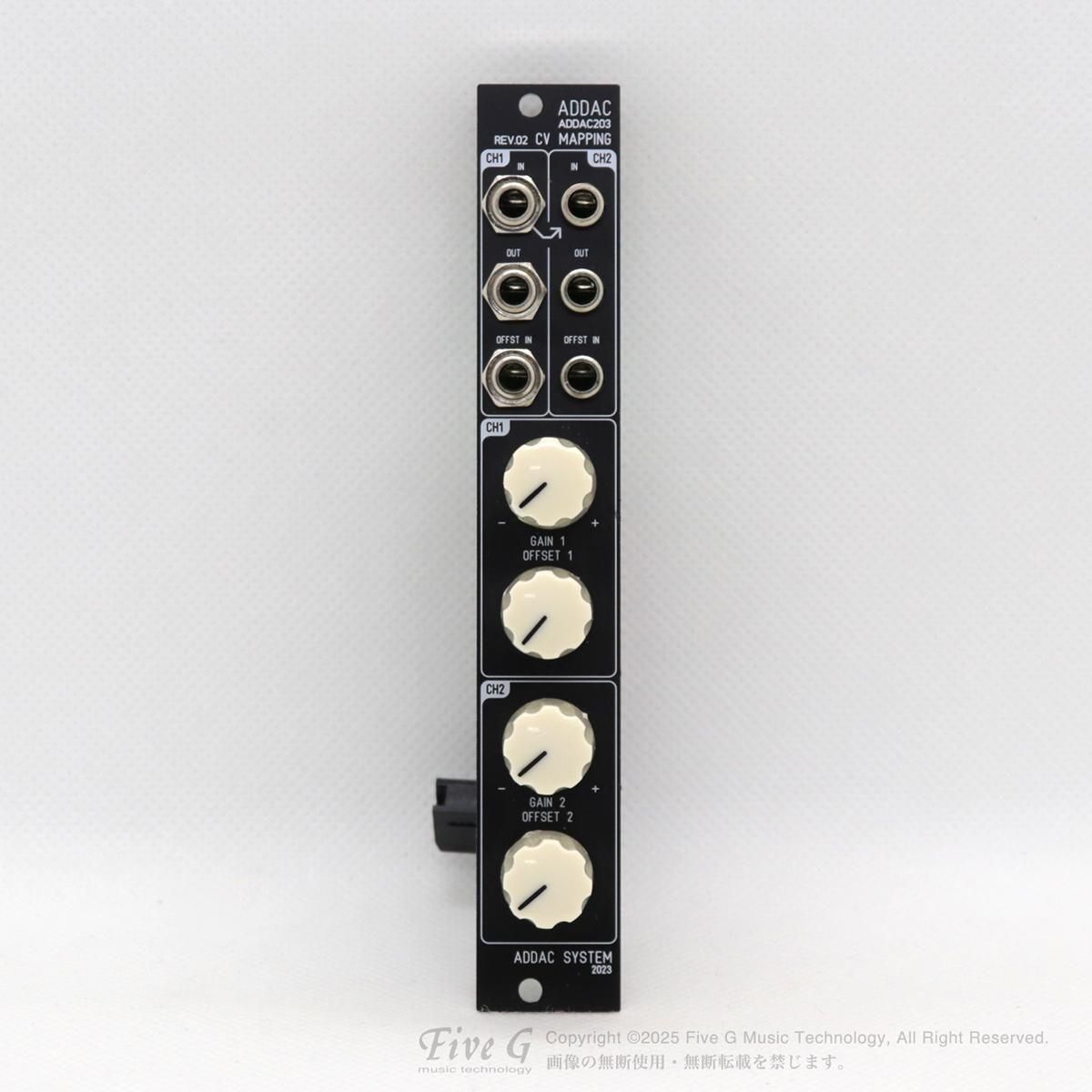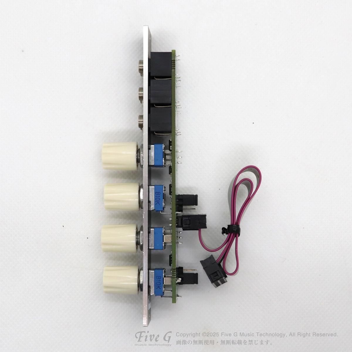 ADDAC203 REV.02 CV MAPPINGは、2010年に登場した初代モジュールの改良版で、コンパクトな6HPサイズに進化し、新たにオフセットCV入力を搭載した高機能ユーロラックモジュールです。このモジュールは、入力信号の振幅を精密に制御し、位相の反転やオフセット調整を可能にする多用途なツールです。入力信号の振幅を[GAIN]ノブで、アッテネート(減衰)から位相反転まで柔軟に対応します。背面のジャンパー設定で最大ゲインをx1(ユニティゲイン)またはx10に切り替え可能。さらに、抵抗値を変更することでDIYカスタマイズも可能です。また、ゲイン処理後の信号にオフセットを追加し、-5Vから+5Vの範囲で信号を上下にシフト。調整は[OFFSET]ノブまたはCV入力で行えます。入力信号がない場合でも、[OFFSET]ノブとCV入力を使用して-5V〜+5Vの電圧を生成可能です。 CV信号やオーディオ信号の精密な調整に最適。モジュラーシンセのワークフローにおいて、信号のスケーリング、位相反転、DCオフセットの追加など、多彩な用途に対応します。コンパクトな設計ながら、柔軟性と拡張性を兼ね備えたこのモジュールは、初心者から上級者まで幅広いユーザーに適しています。